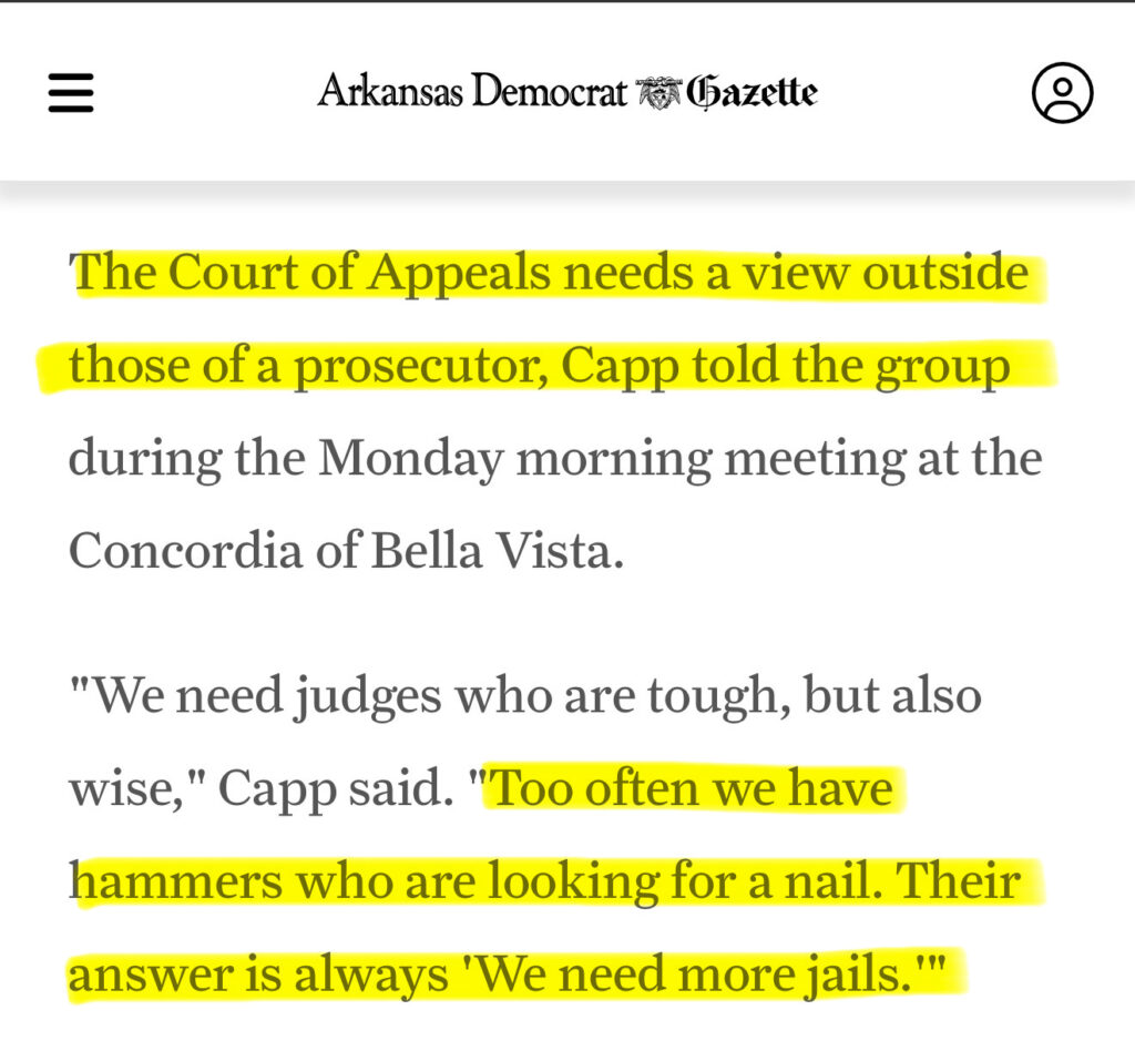 Sarah Capp says of prosecutors, “Too often we have hammers who are looking for a nail. Their answer is always ‘We need more jails.'” Full article here: https://www.arkansasonline.com/news/2025/nov/17/arkansas-court-of-appeals-rivals-contrast-their/